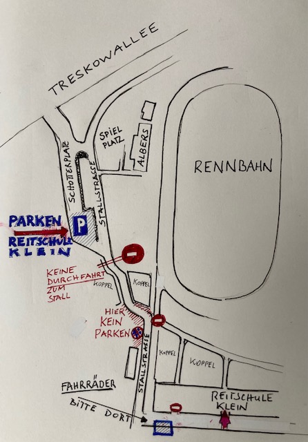 Zu Fuß/mit Fahrrad: Wenn Du auf dem Gelände des Pferdesportparks angekommen bist (Einfahrt mit großem Schild „Pferdesportpark“), folgst Du der gepflasterten Straße, bis Du das Schild für den Parkplatz des Therapiezentrums siehst. Davor biegst Du bitte links ab auf die Stallstraße. Auf der linken Seite befindet sich der Kompaktstall. Nutze bitte den zweiten Eingang auf der linken Seite, gehe gerade durch den Stall hindurch bis Du auf der linken Seite unsere Stallgasse siehst (durch die neue Holztür und Aushänge zu erkennen). Wo sich der Fahrradparkplatz befindet, siehst Du auf unserer Skizze.